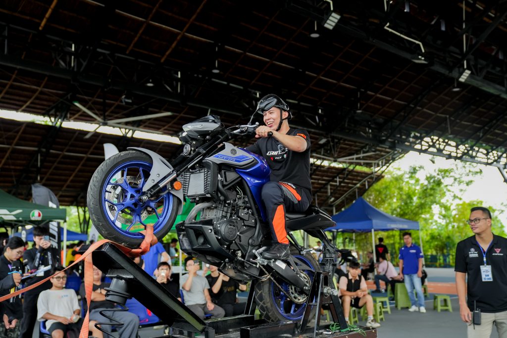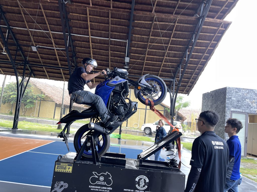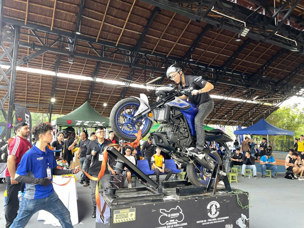 Khu vực trải nghiệm Wheelie Machine là nơi các biker thử sức kỹ năng điều khiển xe bốc đầu trên máy tập chuyên dụng, vừa an toàn vừa đầy phấn khích. Tiếng reo hò cổ vũ liên tục vang lên mỗi khi có màn biểu diễn ấn tượng.